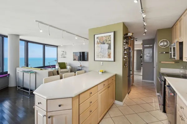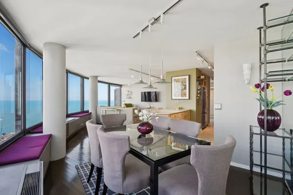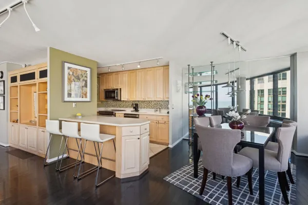 Top Floor Penthouse Level - Unit 5404 is a spacious 1 bedroom /1.1 bathroom home located in Lakeshore East at prestigious Harbor Point. With 13 windows throughout, this thoughtful floor-plan is set in the "curve" and provides stunning views of the city, lake and Navy Pier. Unit highlights include a stainless kitchen with generous cabinet/counter space and breakfast bar seating for three, separate dining area, spacious primary bedroom with French doors and en-suite bathroom, powder room/half bath, extra deep entry closet, in unit washer/dryer, wood flooring, and built in window seat storage, Harbor Point is a full amenity building offering an indoor pool, hot tub, exercise facility, men's and ladies locker rooms with steam and saunas, basketball & racquetball courts, sundeck, Wi-Fi room, 24HR door-staff, Bockwinkel's grocery store, bike storage, dry cleaners, laundry, hobby, party (2), receiving and children's play rooms. Located steps from Maggie Daley Park which features a rollerblading ribbon (summer)/ice skating ribbon (winter), children's playground, tennis courts, Millennium Park, Michigan Ave shopping and world class restaurants. Mariano's grocery store is two blocks away. CTA 60 bus stops directly in front of the HP building entrance and the "L" is conveniently located at Randolph & Wabash. Cable (basic) and internet included in assessments. 25lb pet weight limit with 2 pet limit only 1 of which may be a dog. Parking is rental. 30 minute free guest parking in garage.