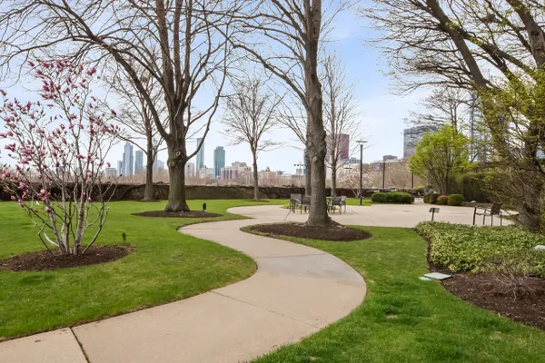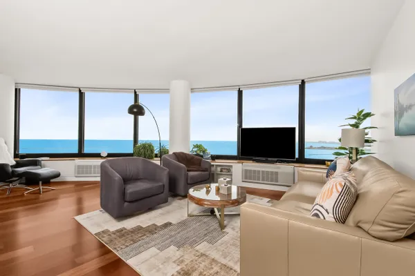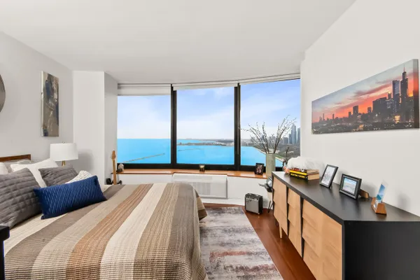 Exceptional 1-bedroom residence at 155 North Harbor Drive featuring stunning south and east exposures with sweeping views of Navy Pier, Monroe Harbor, and Grant Park. This beautifully maintained home showcases cherry hardwood floors, an oversized living room, and a separate dining area-perfect for both entertaining and everyday living. The well-appointed kitchen offers Corian countertops, GE and Bosch appliances, an undermount sink, under-cabinet lighting, and abundant storage including pull-out drawers. The spacious bedroom suite features a walk-in closet and a fully upgraded en-suite bath with marble tile, Corian vanity, Hansgrohe fixtures, and a built-in mirrored medicine chest. A stylish guest half bath includes marble flooring and a large vanity. Bosch in-unit laundry adds everyday convenience. Excellent closet space throughout, including two entry closets with custom doors. Full-amenity building with 24-hour door staff, indoor pool, fitness center, outdoor patio and garden, and common laundry facilities. On-site grocery store and rental parking available. Unbeatable New Eastside location just steps to the lakefront, parks, dining, and shopping.
