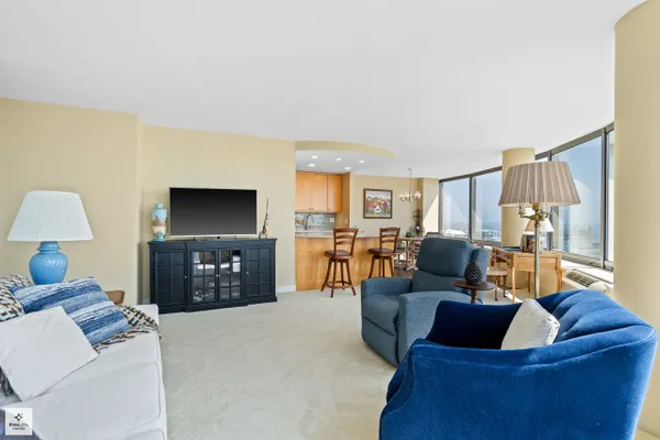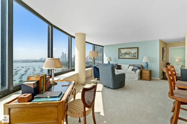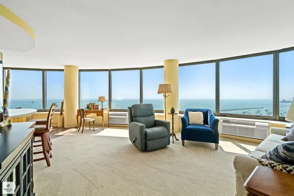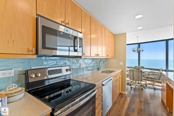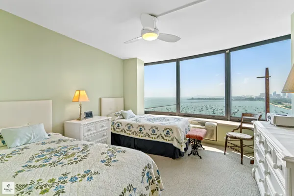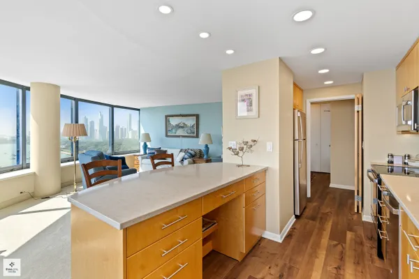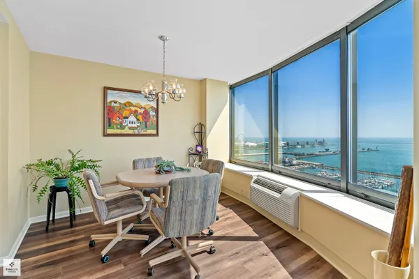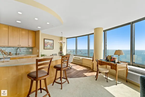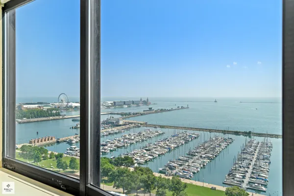 Rarely available 1 Bedroom 1.1 Bath home in Harbor Point's "09" tier. Set in the easternmost curve, unobstructed lakefront views span Navy Pier to Michigan and Indiana, the Chicago skyline, Museum Campus, Grant Park, Buckingham Fountain, Chicago Yacht Club and more landmarks to the west. Twice weekly lakefront fireworks May-August. Thoughtfully renovated in 2022. Light contemporary kitchen cabinets with full height aquamarine backsplash, quartz countertops, island with pull-outs and seating space, stainless appliances, double bowl under mount sink, recessed cabinet & ceiling lighting. Custom bi-fold kitchen doors allow for formal flow. The bedroom en-suite bath (2017 remodel) features a custom glass-enclosed shower with floor-to-ceiling marble surround, glass shelving & marble flooring which extends into the efficiently designed home office/walk-in closet. Washer/dryer hookups in linen closet. Custom paint and lighting. Window seat storage (new window seat tops), generous closet space & additional storage cage. Harbor Point's full-service amenities include indoor pool with lap lane, hot tub, exercise facility & weight room, steam and sauna room, racquet ball/basketball/pickleball/ping pong courts, two outdoor sundecks with gas grills, seating, lounge chairs and hammocks, Bockwinkel's grocery open till 10 PM, 24-hour door-staff, bike room, dry cleaners, on-site garage with visitor parking and car wash, laundry with library, two party rooms and children's play rooms. Prime Lakeshore East location steps to Maggie Daley & Millennium Park, rollerblading & ice skating ribbon, playgrounds, tennis courts, Mariano's grocery & world-class shopping & dining. CTA #60 bus stops in front of the building. Basic cable and internet included in assessments. Parking is rental and available. 25lb pet weight limit. 1 dog only, 2 pet limit. Strong reserves, never a special assessment.